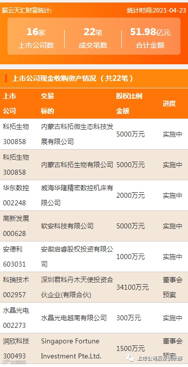 2021年4月23日,资产交易合计金额51.98亿元,上市公司数16家,成交笔数22笔,上市公司挂牌转让资产22笔。