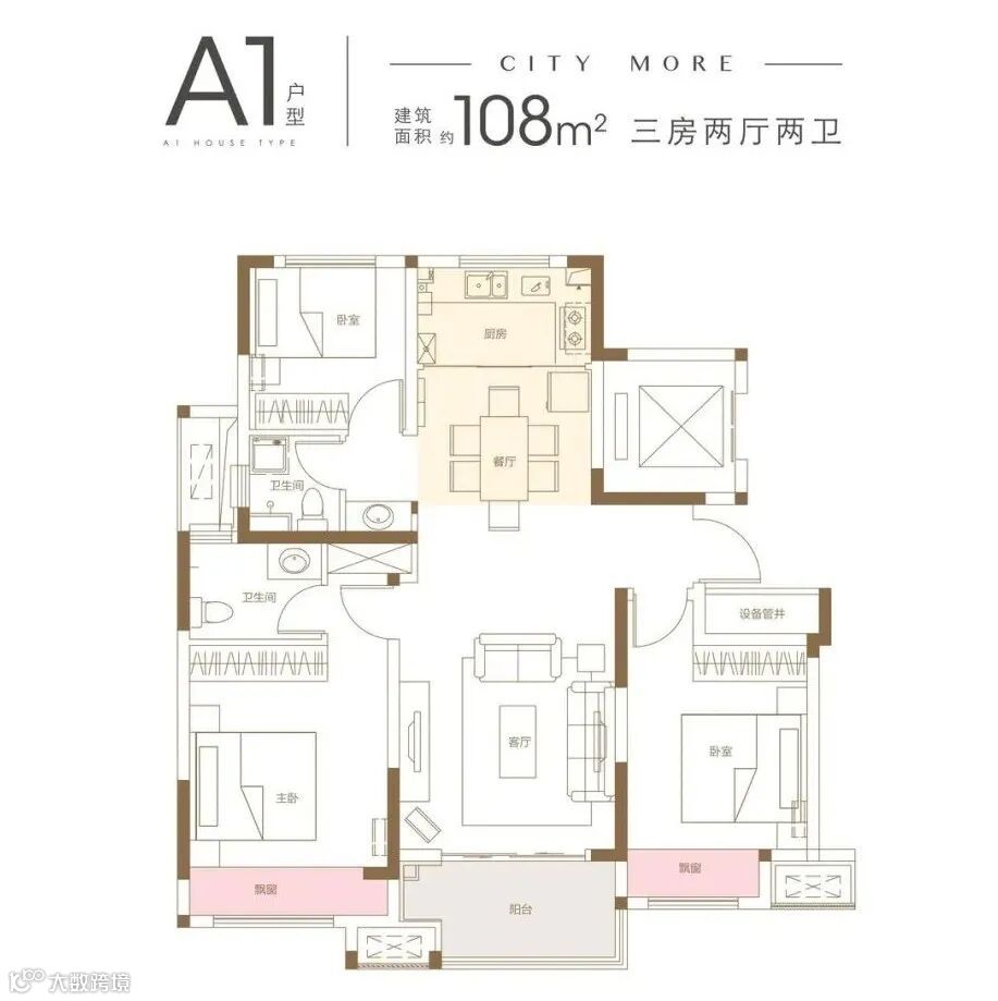 项目建面约95㎡三室两厅一卫,户型约9.3米南向三面宽,约6米双联阔阳台,客厅、餐厅、阳台一线相连,动静分区。
