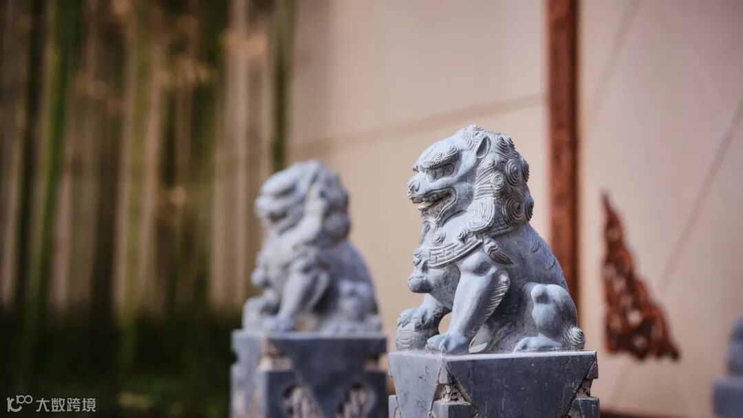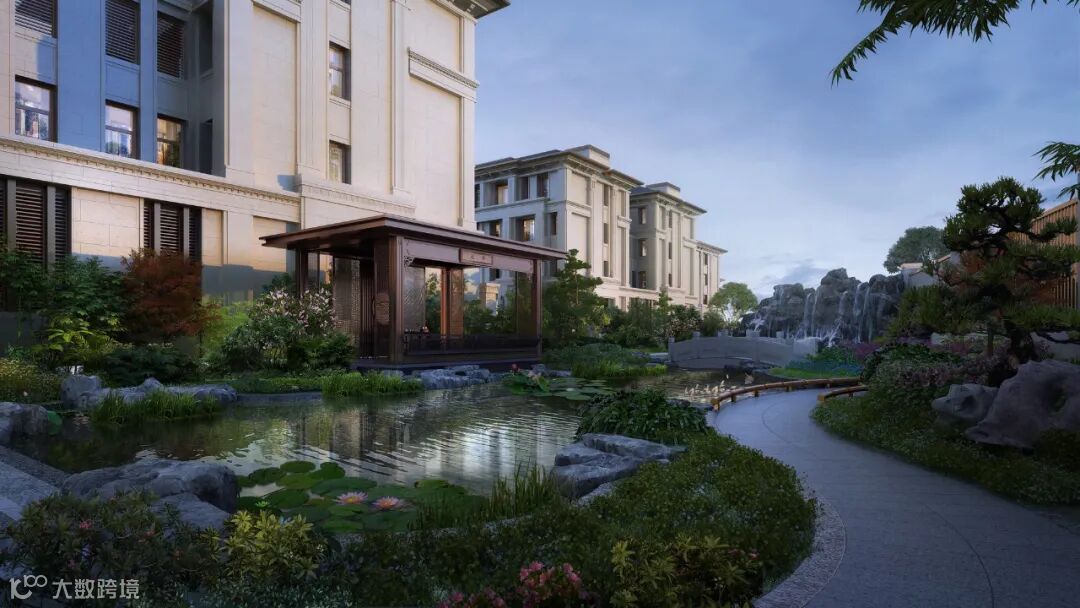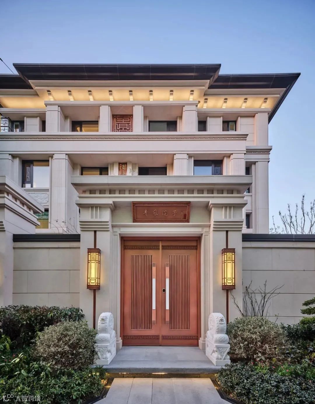 大门左右两侧放置雕刻有鹿,或者荷花、麒麟纹样的汉白玉抱鼓石,寓意吉祥美好的生活愿景;大门内地面有大型龙饰地雕,同样用汉白玉打造,龙纹常常寓意祥瑞,彰显庭院主人身份的尊贵感。院子立面设计理念为现代简约中式,中魂西韵,居中守正,从而酝酿出现代简约兼具东方生活美学的中式建筑风格。