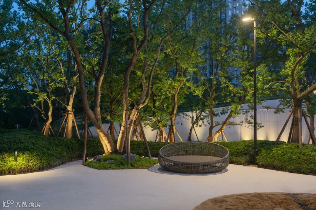 社区围绕中心花园,展开1轴2环3庭8景,并循迹雍正年间郑州老八景,解构场所精神,营造生活之境,山石、流水、庭院、花木、光影、桌椅等都颇有讲究。