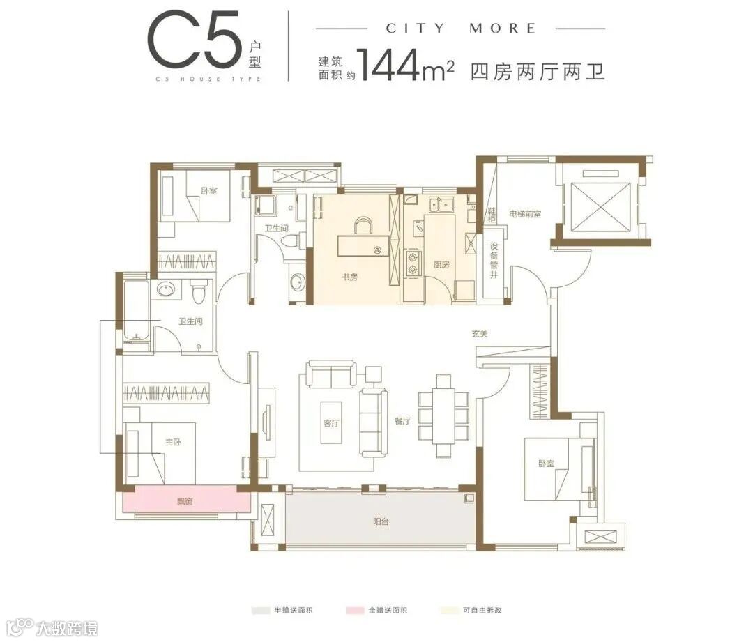 项目142m²户型 全明户型,户型方正,整个室内的排布比较合理。三个卧室、一个书房分散分布,保证了各空间的私密性,可以做到互不干扰,便于休息、学习。