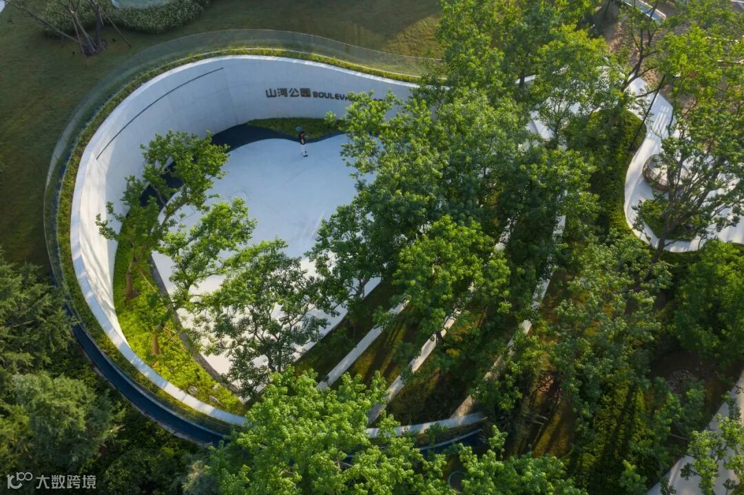 山河道结合公园城市的设计理念打造十字轴人行广场,结合街角公园、街心广场、银杏大道、幼儿园等配套设施,构建成为一个完善的“十字街区”生活体系。