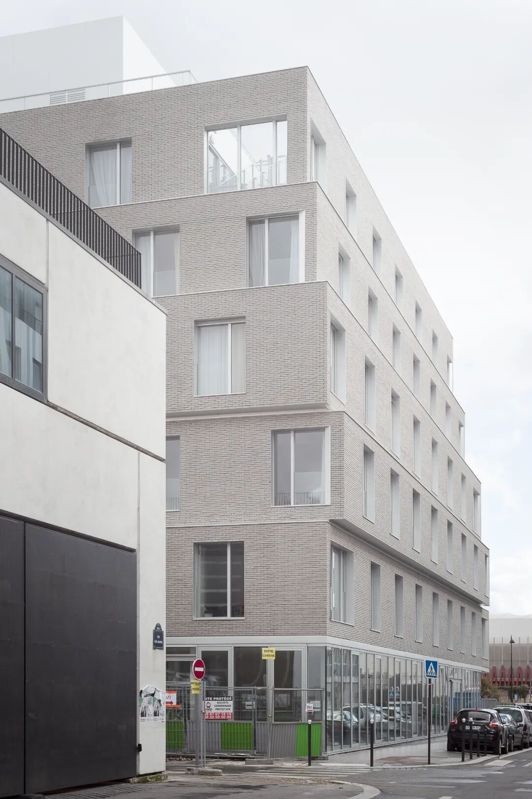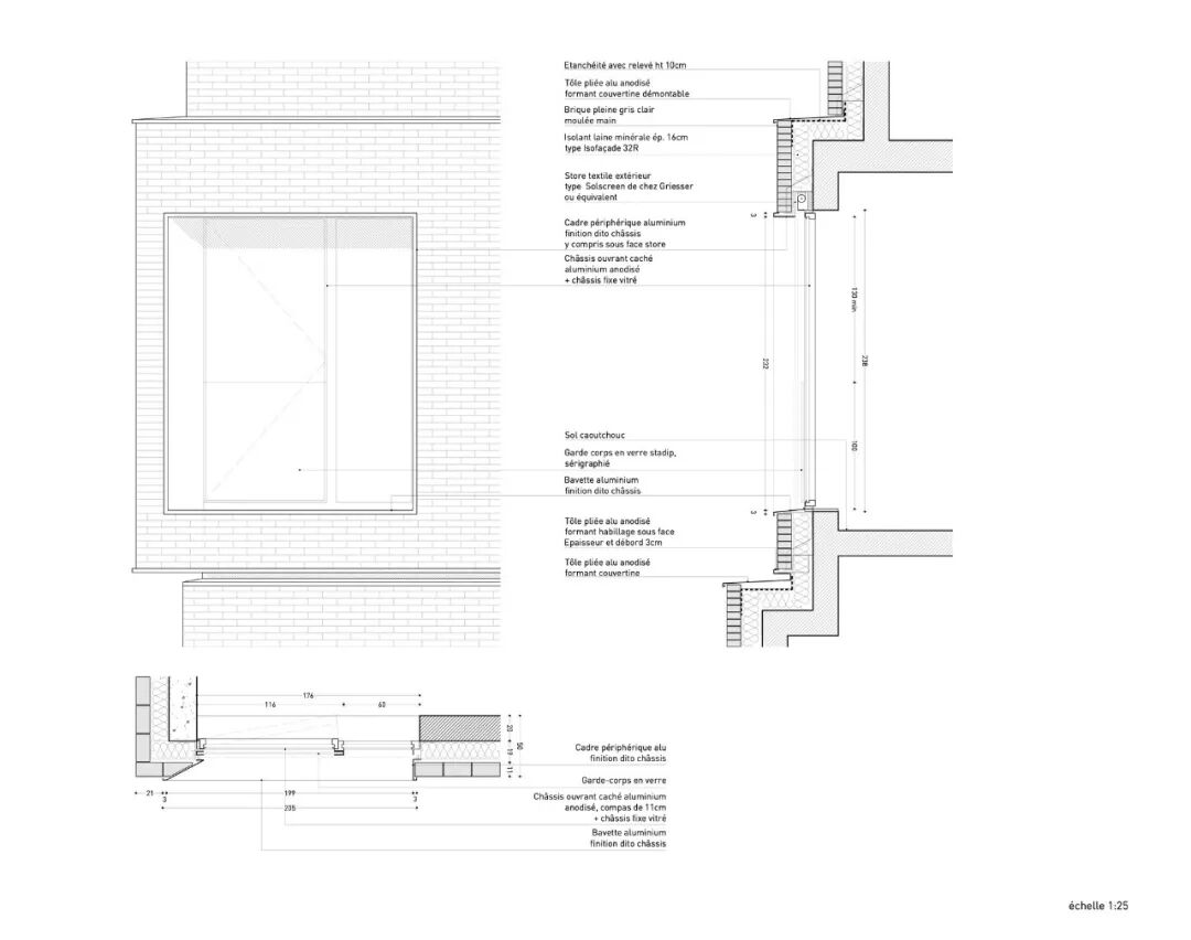 铝制窗户具有耐腐蚀的特性,阳极氧化的颜色与灰色的砖块相协调。集成在窗框中的玻璃护栏允许在整个窗户高度上安装外部纺织百叶窗。内部的透明窗帘使窗户的设计更加完美。