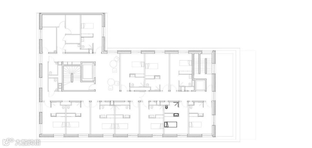 住宿单元分为两层,分别位于第二层和第三层,第四层和第五层。没有公寓是单向北的,服务设施是背靠背安装在东北的毗邻建筑。