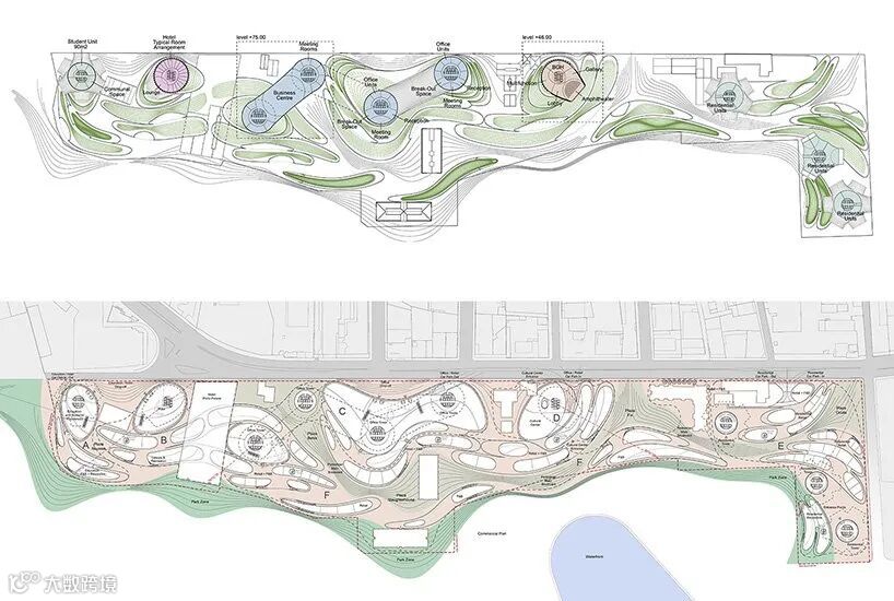 平台设计在较低的楼层,作为一个流动的、多项目的区域,激发基地区域、邻近的城市区域和城市滨水区的活力。