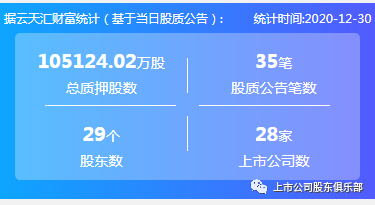 2020年12月30日,股票质押总质押股数105124.02万股,上市公司数28家,股质公告笔数35笔,股东数29个。
