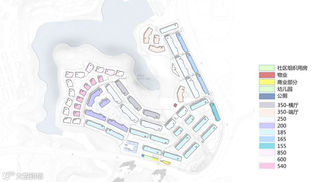 建筑师因地制宜地利用建筑高差形成层层递退的空间关系,将景观资源接连不断地引入到场地内部。沿湖亲水、二排赏水,后排览湖,丰裕的景色映入眼帘。
