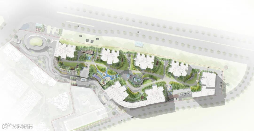 项目整体平面规划出三条景观轴线,有效串联起滨河景观公园,中央城市绿轴,社区景观组团,城市开敞空间等不同等级的的绿化空间,延展出整个片区的生态脉络,使场地积极融入到山水的整体态势之中。
