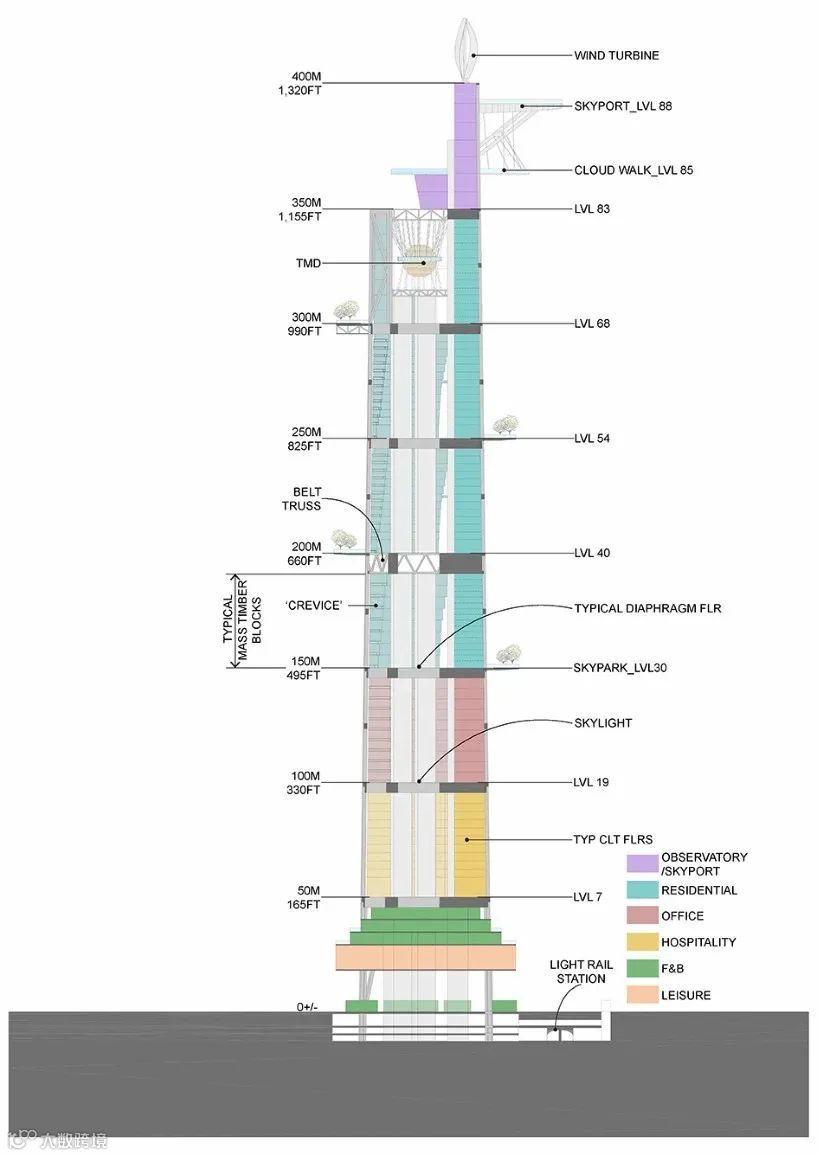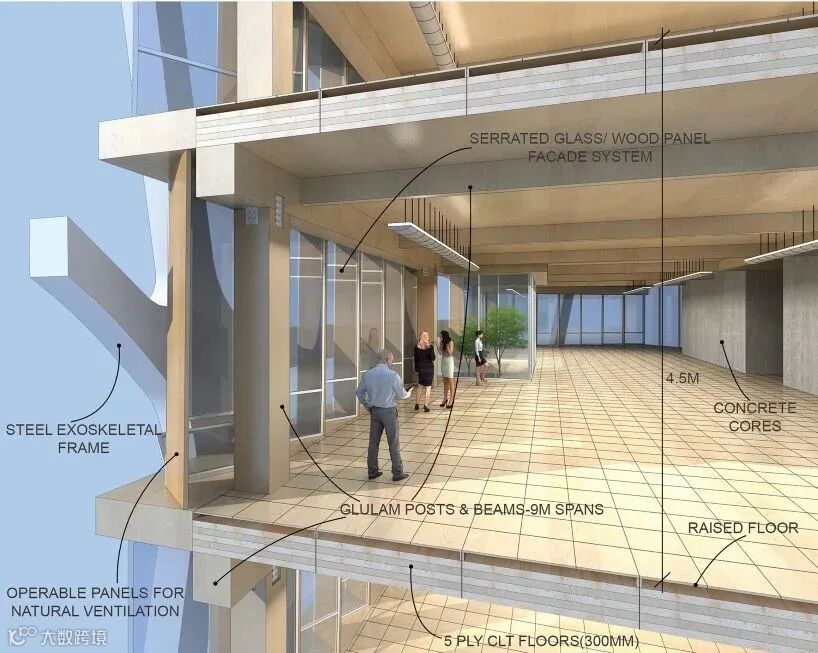 混合结构包括钢外骨架框架和混凝土核心的横向和重力负荷。每50米间隔的隔膜层允许10到12层的木材“城市区域”在空隙中横跨。因此,90%的塔的组成是大量的木材,隔离碳和促进生物环境。