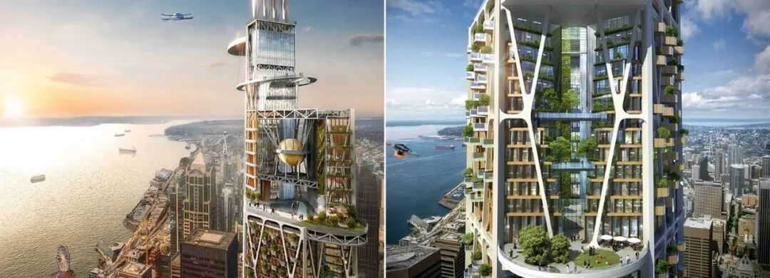 由国际建筑工作室3MIX的ro shroff和shaina yang创作的“西雅图2030”探索了新冠肺炎后十年的摩天大楼会是什么样子。