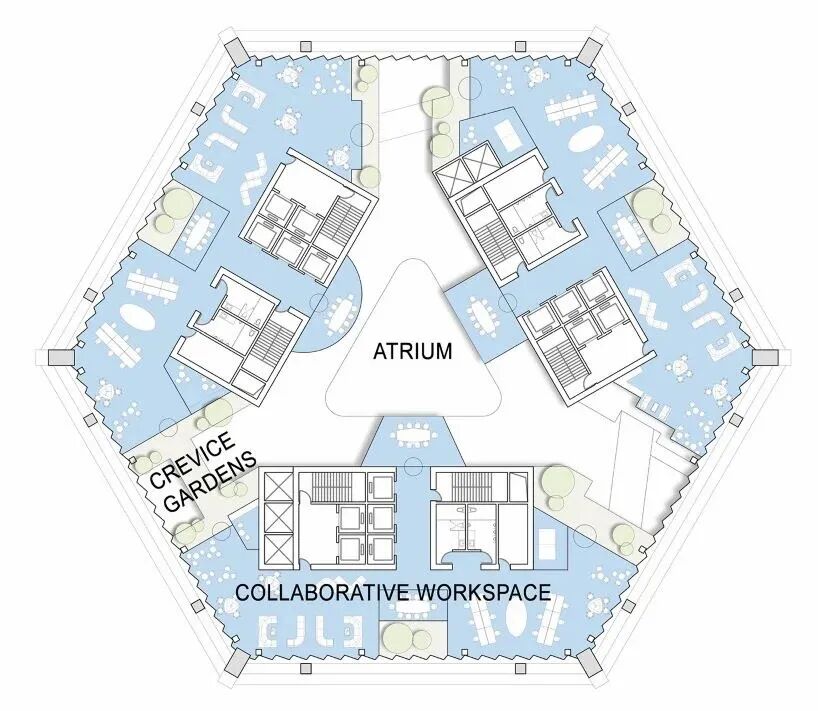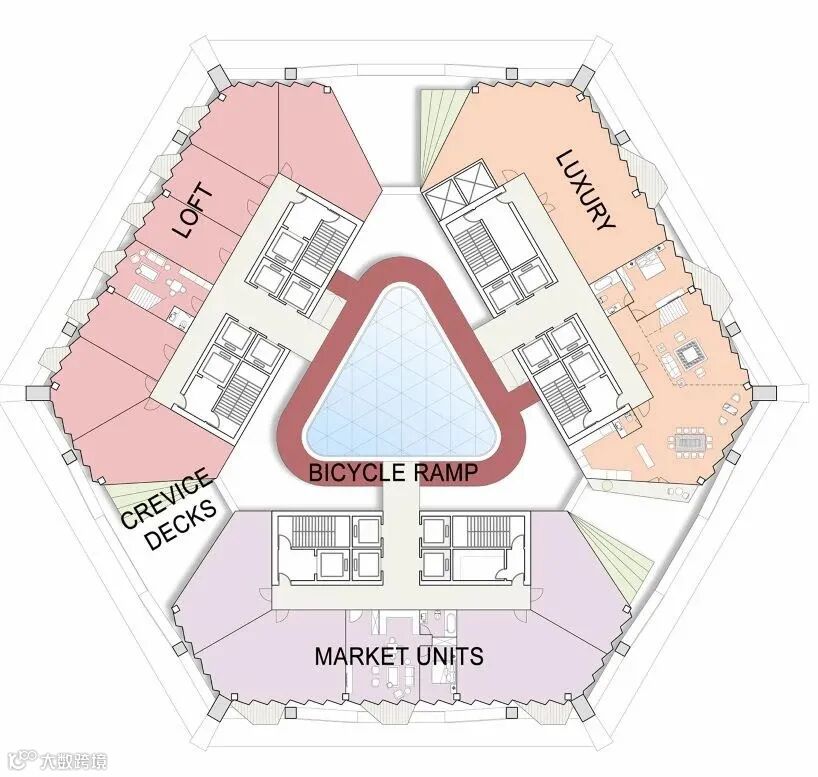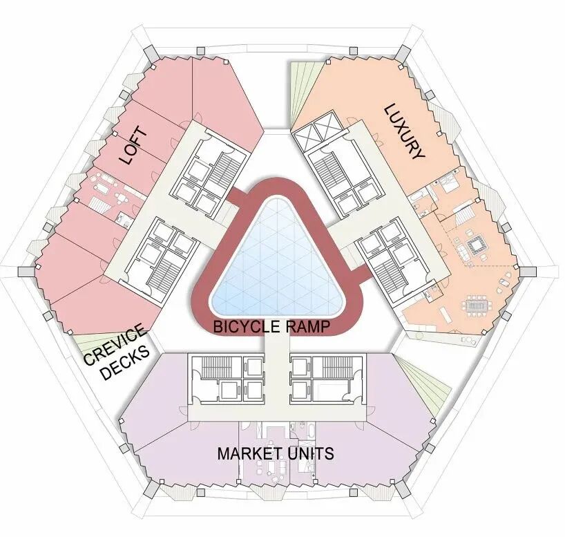 方尖碑状的结构由三个相互连接的六角形“子塔”组成,并被划分为八个堆叠的“超级块”,它们一起包含了150,000平方米的不同用途。