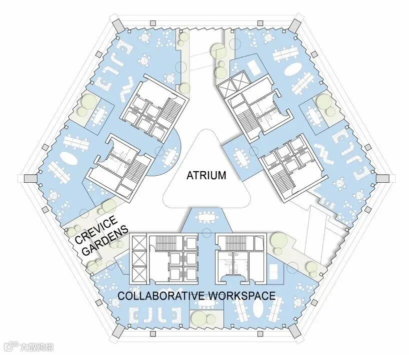 一个令人眩晕的中央天窗中庭让空气通过内部渗透,同时增强了塔的结构行为和性能,以及日光穿透到内部