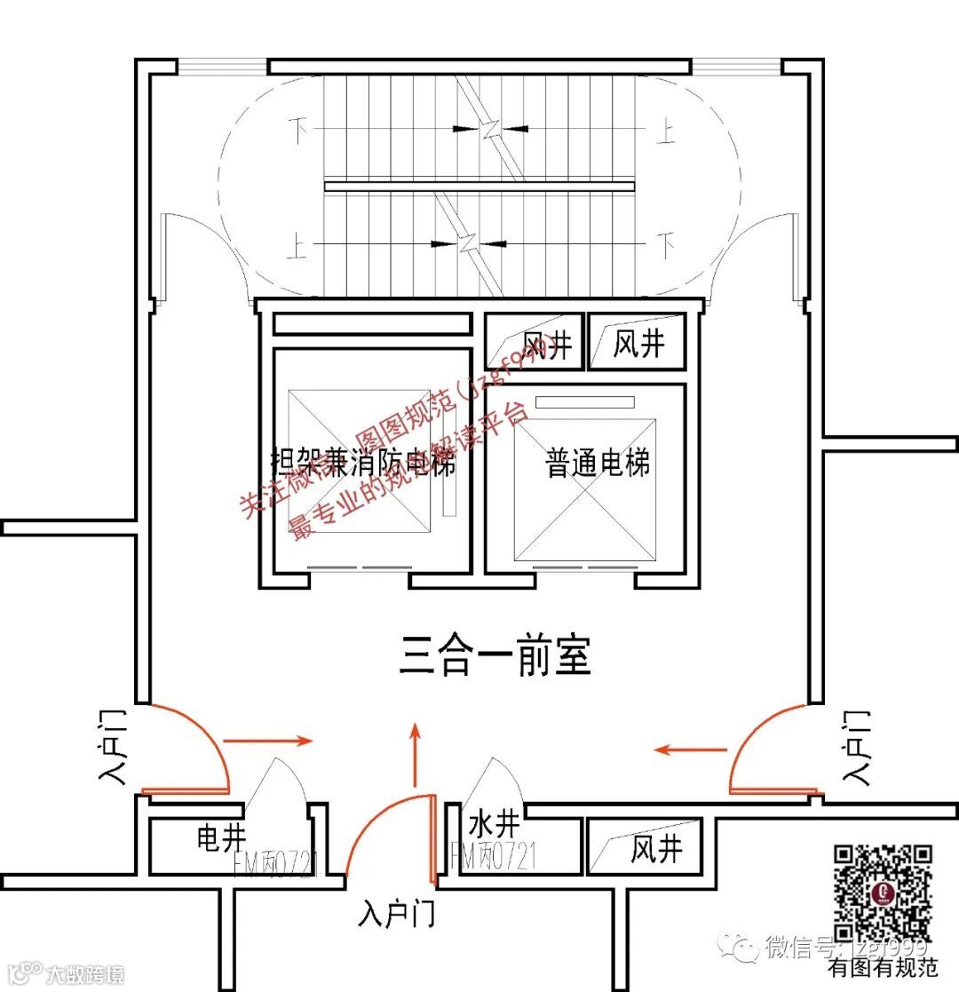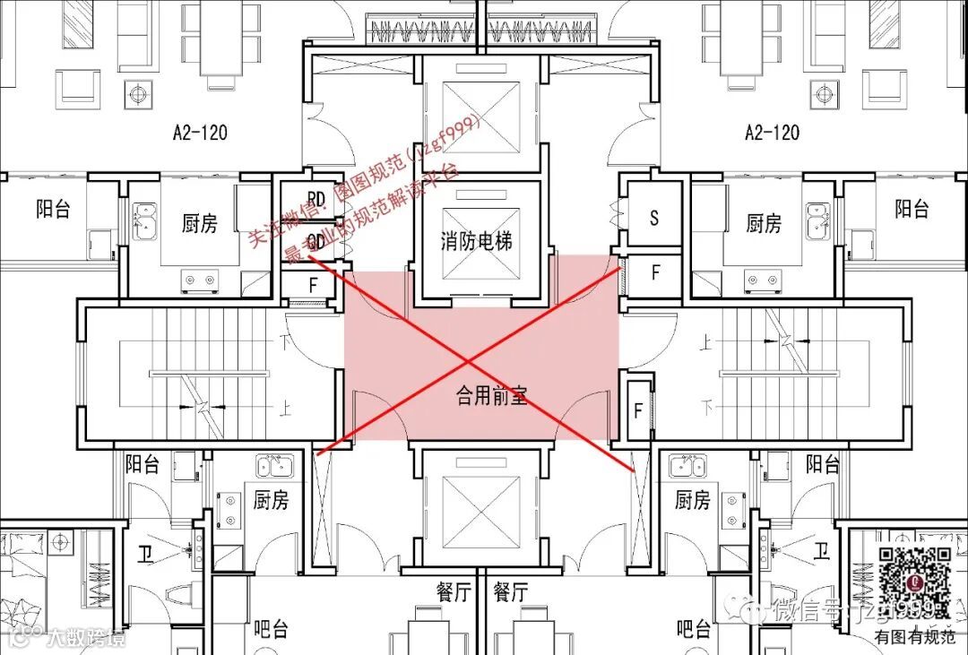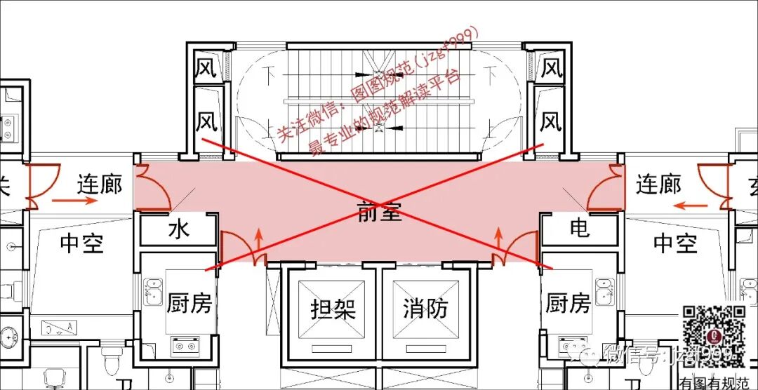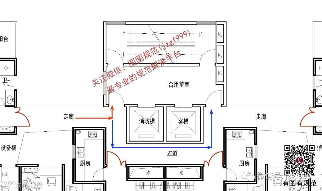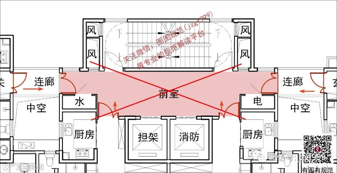 图图解读:左右两户未满足从不同方位进入三合一前室的规定。