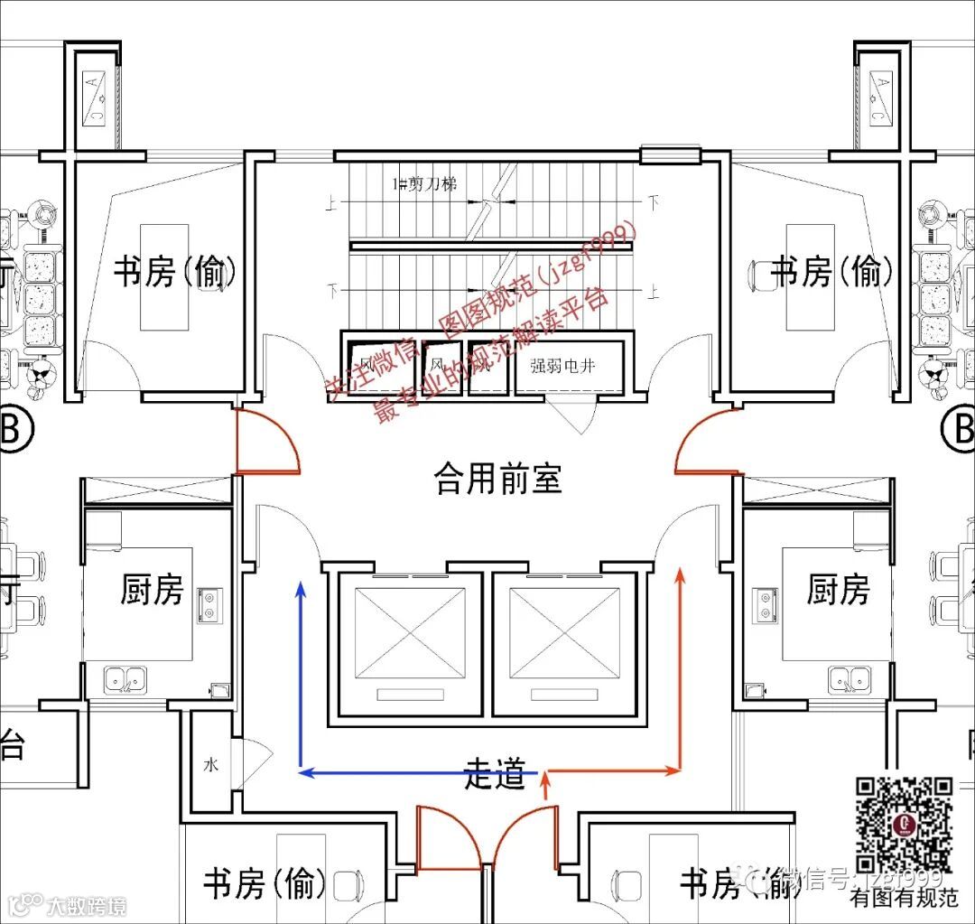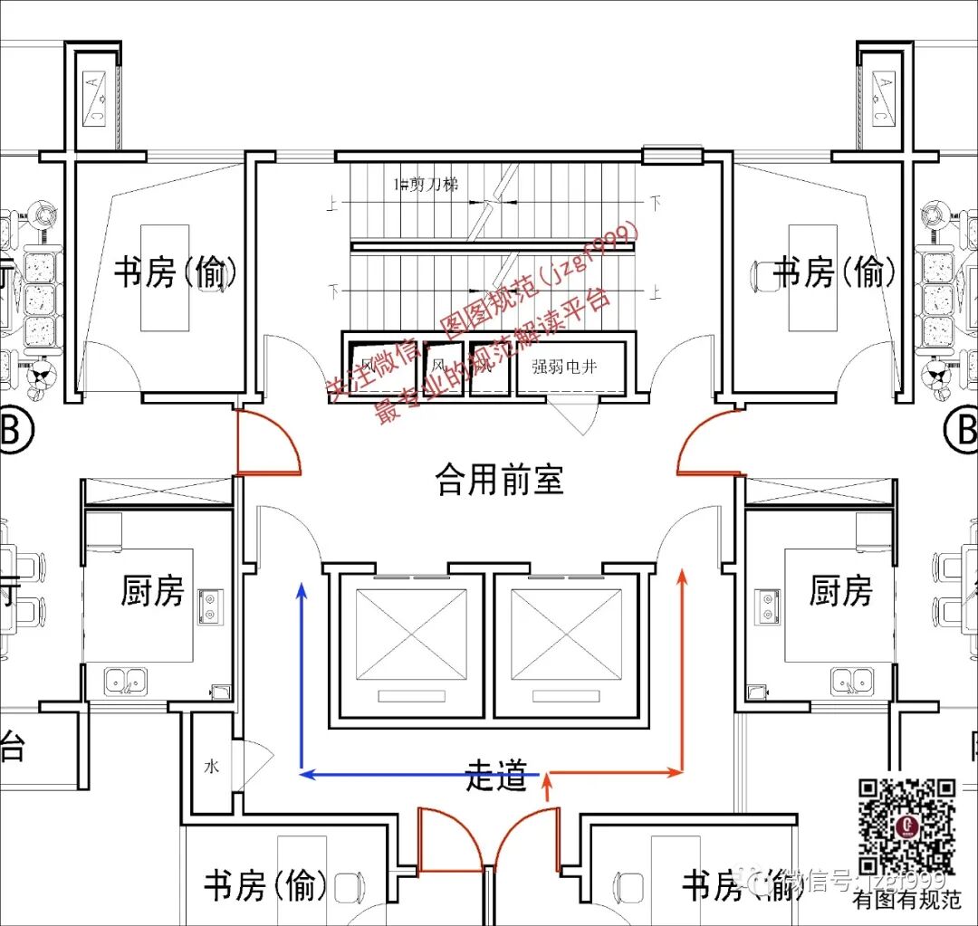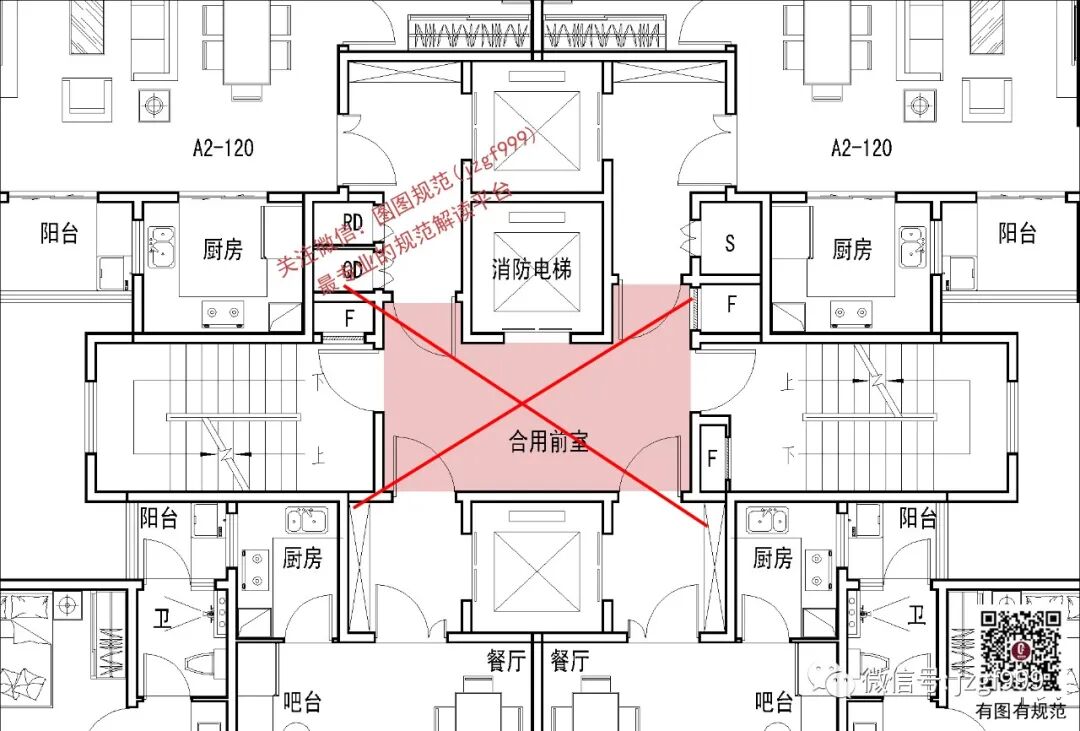 图图解读:左右两户未满足从不同方位进入三合一前室的规定。