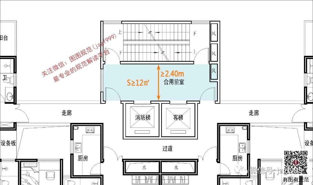 答:合用前室的使用面积不应小于12.0㎡,且短边不应小于2.4m