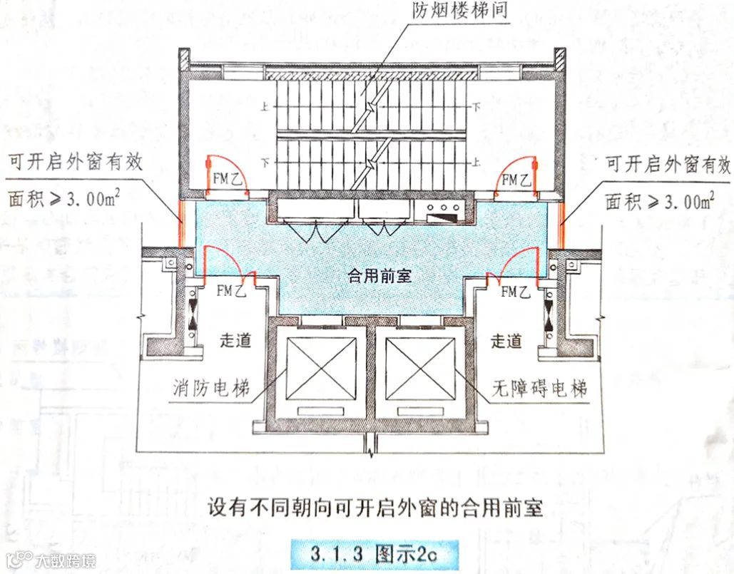 -2)设有两个及以上不同朝向的可开启外窗,且独立前室两个外窗面积分别不小于2.0㎡,合用前室两个外窗面积分别不小于3.0㎡。