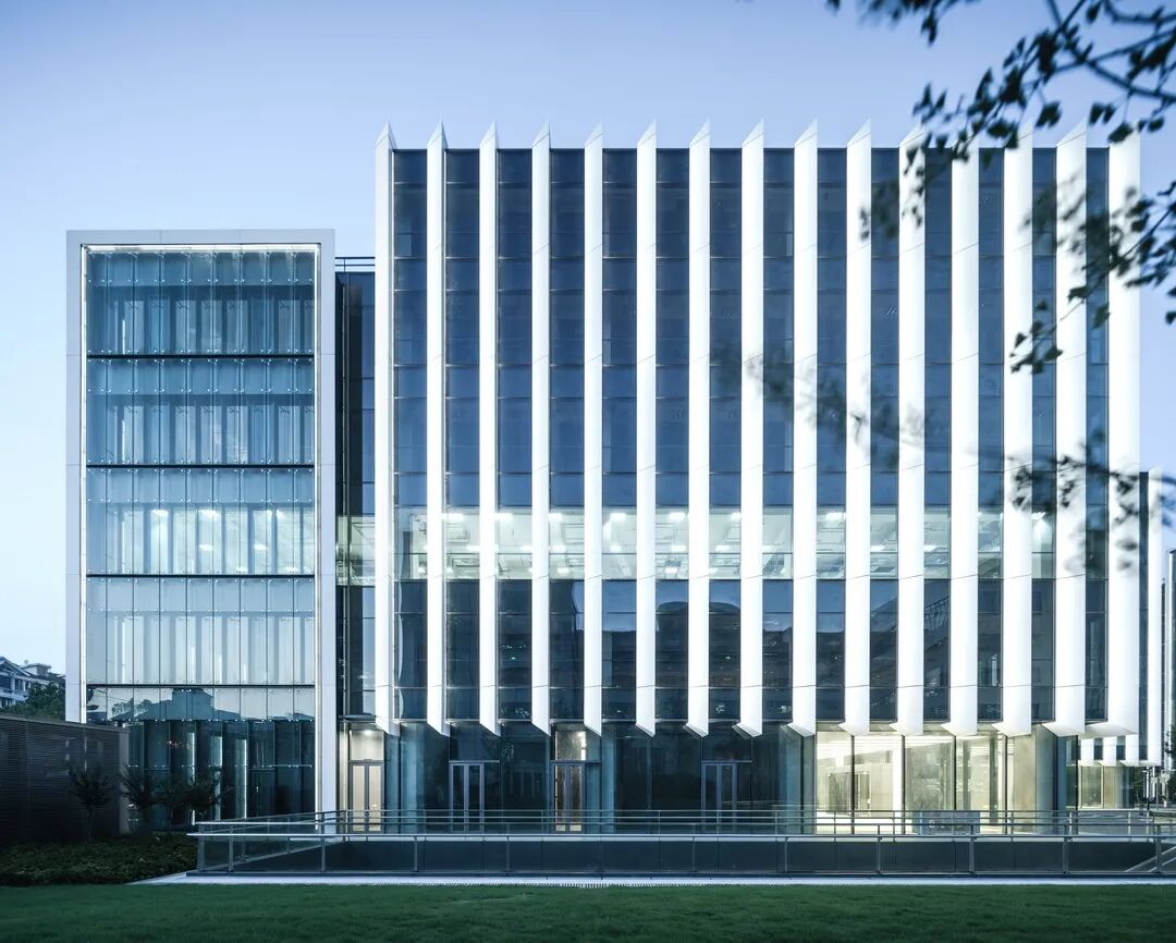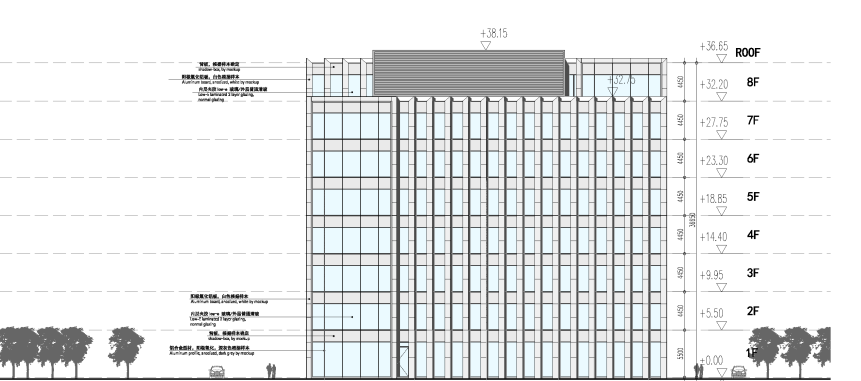 为了达到比较理想的效果,竖向线条的疏密、突出程度,垂直和水平的划分等,都进行了仔细的推敲。主体建筑外墙使用玻璃及金属板幕墙+岩棉保温,主体建筑外墙出屋面部分使用外墙涂料+岩棉保温。