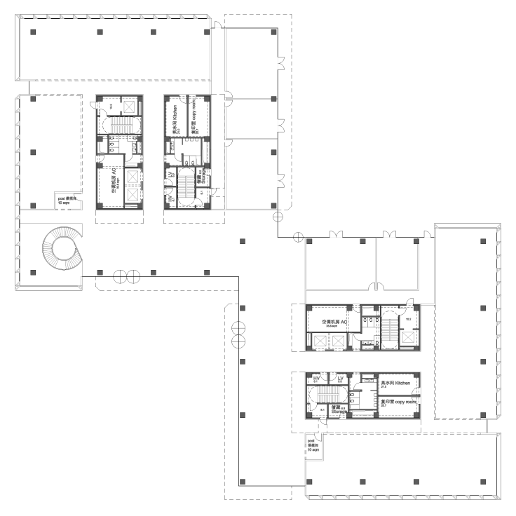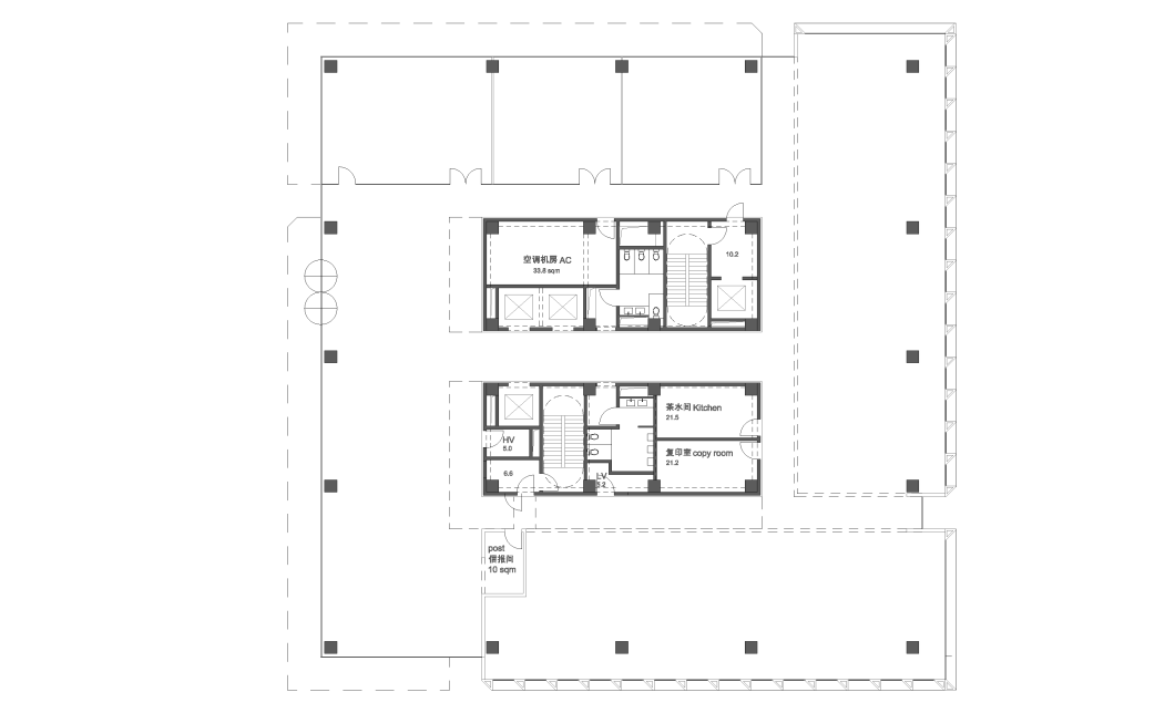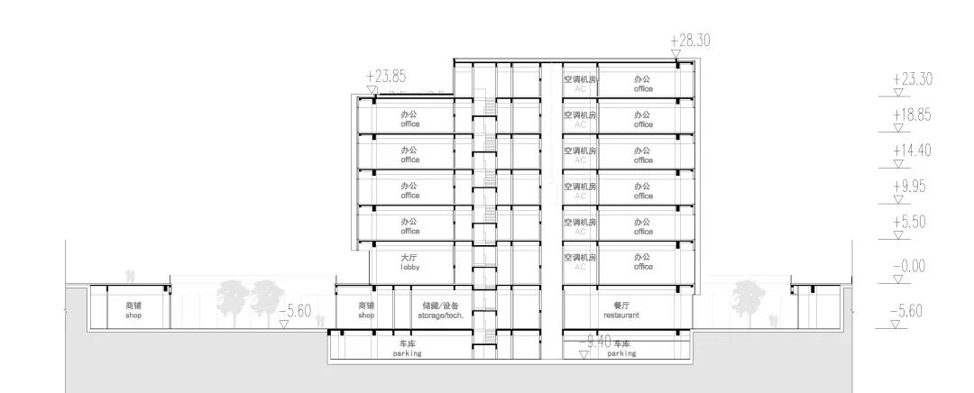 将这两个开放度、通透度不同的面分开的是1.95 米宽的玻璃幕墙形成的缝隙效果,玻璃后是有自然采光的走廊空间。