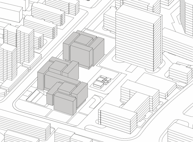 加入新建建筑的总平布置以三个正方底盘的体块为出发点。三个点式体块,与道路、已有建筑平行或垂直,在基地上建立与现有建筑的关系。北面两个体块结合成一个建筑,解决间距、采光问题。