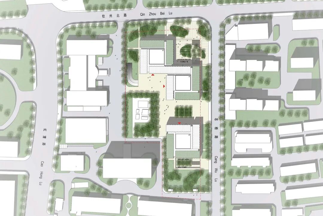 北面一号楼的入口广场通过钦州上现有园区的入口进入,北侧两个体块合并以改善采光,同时在入口处为城市让出一个广场。