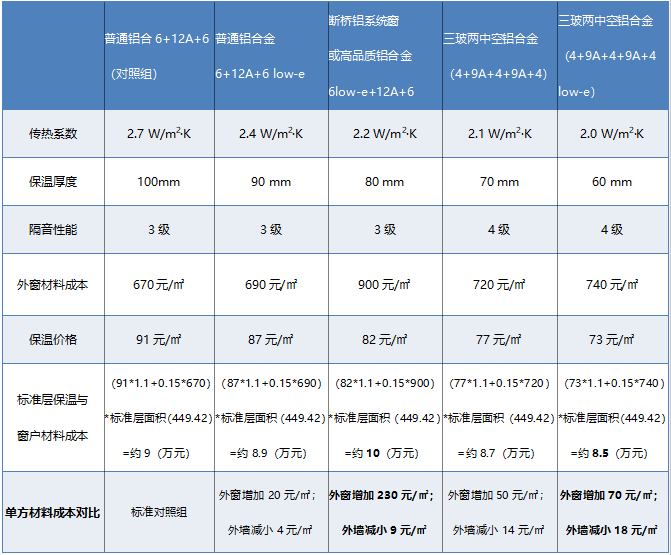 ①在窗户型材及玻璃选型不变的情况下,外墙保温层厚度由60mm提升至100mm,材料成本增幅66%;