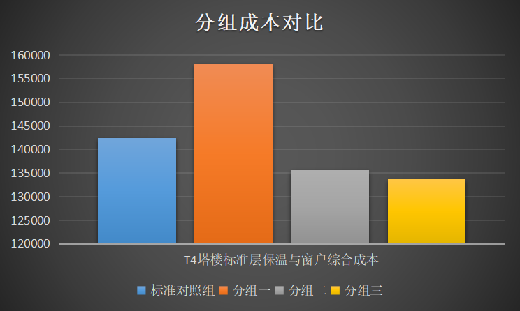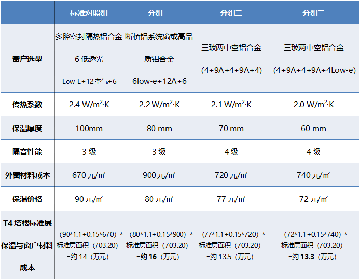 对比分析结果,分组三标准层材料成本造价最低,由此可得,采用三玻两中空铝合金(4+9A+4+9A+4Low-e)窗,可降低外保温层厚度,节约建造成本。