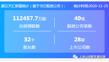 2020年11月25日,股票质押总质押股数112457.7万股,上市公司数28家,股质公告笔数40笔,股东数32个。