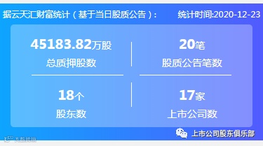 2020年12月23日,股票质押总质押股数45183.82万股,上市公司数17家,股质公告笔数20笔,股东数18个。
