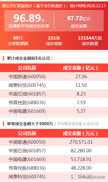 2020年12月17日,大宗交易成交金额97.72亿元,交易股票数99只,成交笔数231笔,流通股平均成交折价率96.89%,成交数量131544万股。