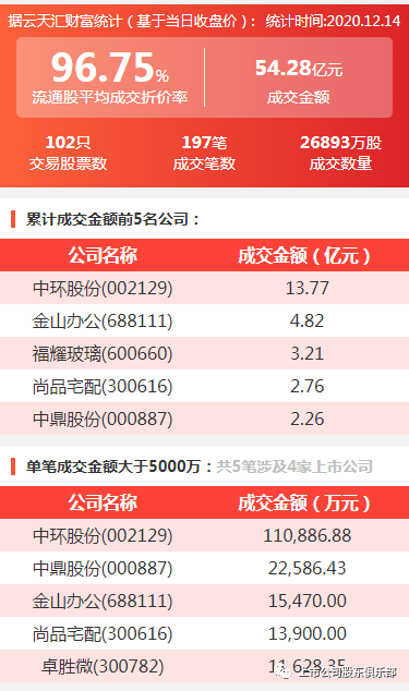 2020年12月14日,大宗交易成交金额54.28亿元,交易股票数102只,成交笔数197笔,流通股平均成交折价率96.75%,成交数量26893万股。