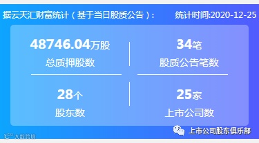 2020年12月25日,股票质押总质押股数48746.04万股,上市公司数25家,股质公告笔数34笔,股东数28个。
