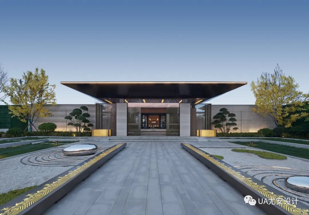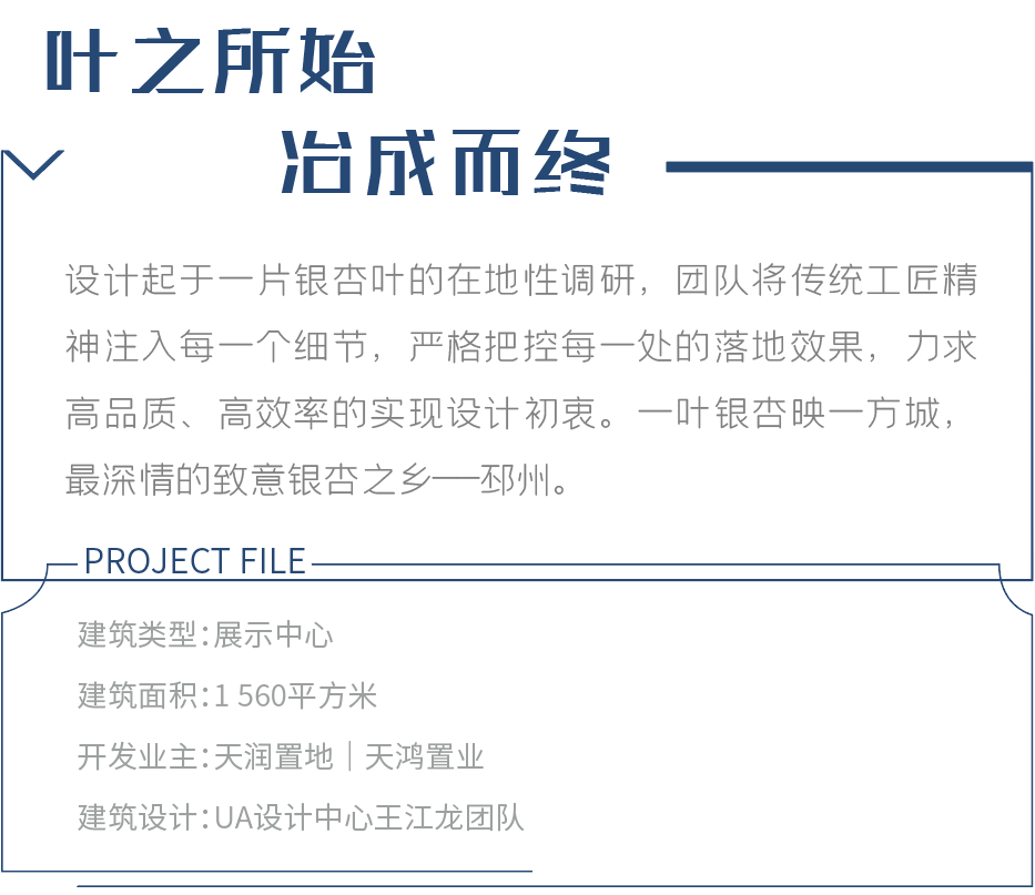 珑玺湾展示中心,地处京杭运河沿岸具有水乡特色和历史文化底蕴的生态宜居城市,素有“银杏之乡”之称的邳州。基于场域特质,团队提取“水乡 底蕴 银杏”三个关键词作为设计要素,融合中国传统“泗水归堂”之格局,以体现建筑除了要承载理性的社会功能属性,也要被赋予自身感性的城市印记的理念。