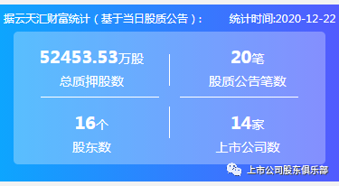 2020年12月22日,股票质押总质押股数52453.53万股,上市公司数14家,股质公告笔数14笔,股东数16个。