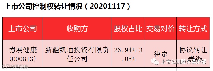 2020年11月17日,德展健康(000813)公告计划转让控制权,1家上市公司公告计划收购资产。