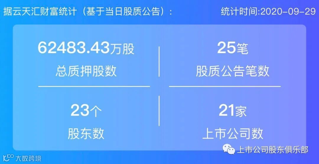 2020年9月29日,股票质押总质押股数62483.43万股,上市公司数21家,股质公告笔数25笔,股东数23个。