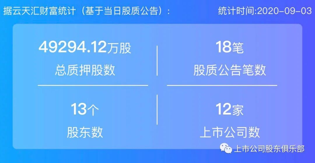 2020年9月3日,股票质押总质押股数49294.12万股,上市公司数12家,股质公告笔数18笔,股东数13个。