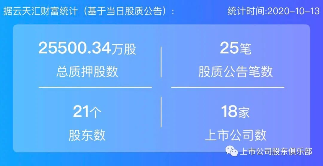 2020年10月13日,股票质押总质押股数25500.34万股,上市公司数18家,股质公告笔数25笔,股东数21个。