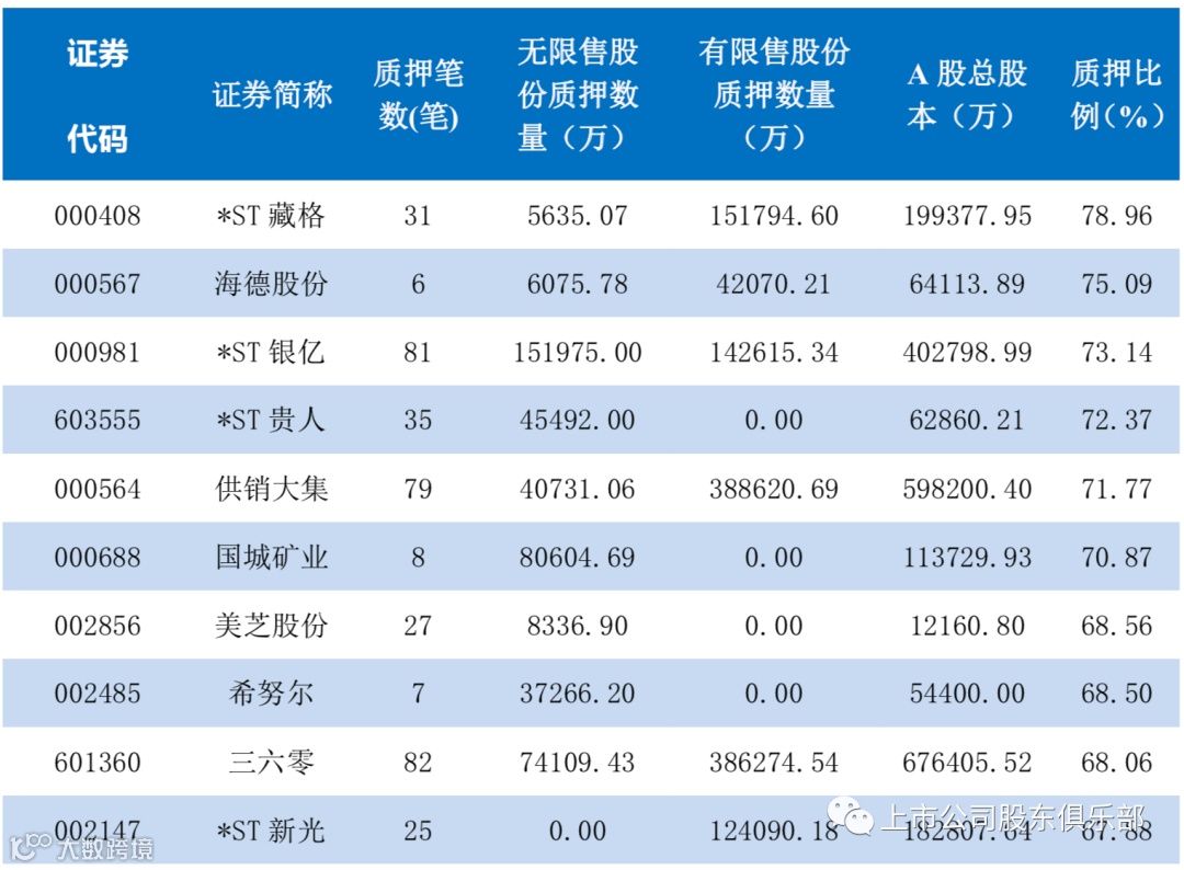 表3-单一股票质押比例排名前十的股票(7月末)