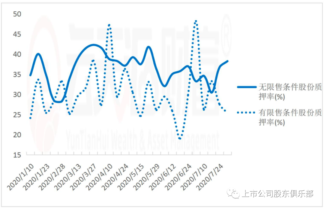 7月份上交所的流通股质押率平均值为34.68%,限售股质押率平均值为32.11%,深交所的流通股质押率平均值为29.56%,限售股质押率平均值为25.36%。除上交所的限售股质押率高于全年平均水平,7月份上交所流通股、 深交所流通股和限售股质押率均低于全年平均水平。