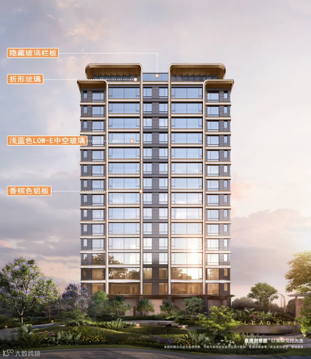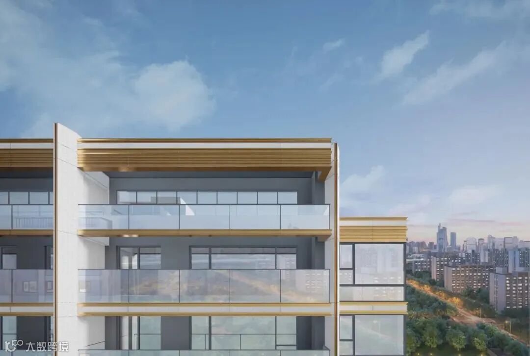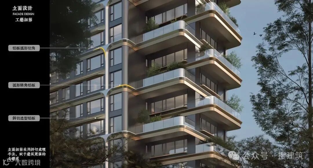 外立面香槟色铝板斜切框套轮廓线,画骨东方精致,让外立面更几何、立体,在光影交错间,优雅而灵动,满满“高级感”。