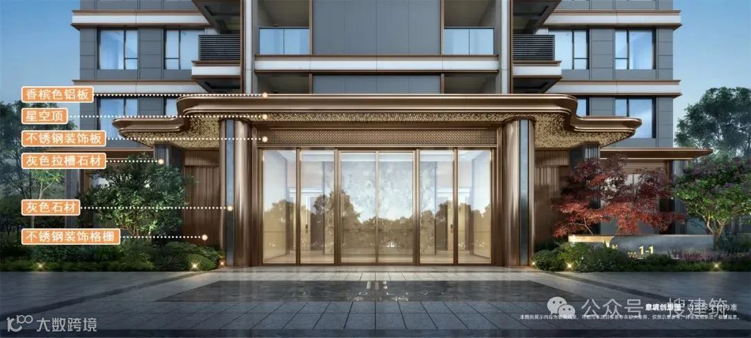 底部基座局部采用石材等高品质材料搭配香槟金色铝板,给予业主更尊贵的归家仪式感。