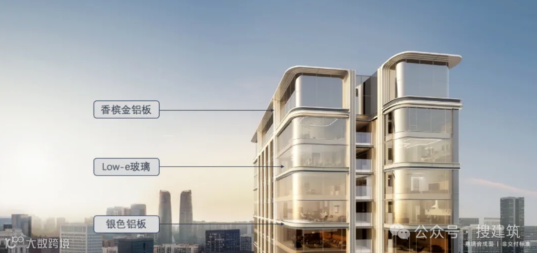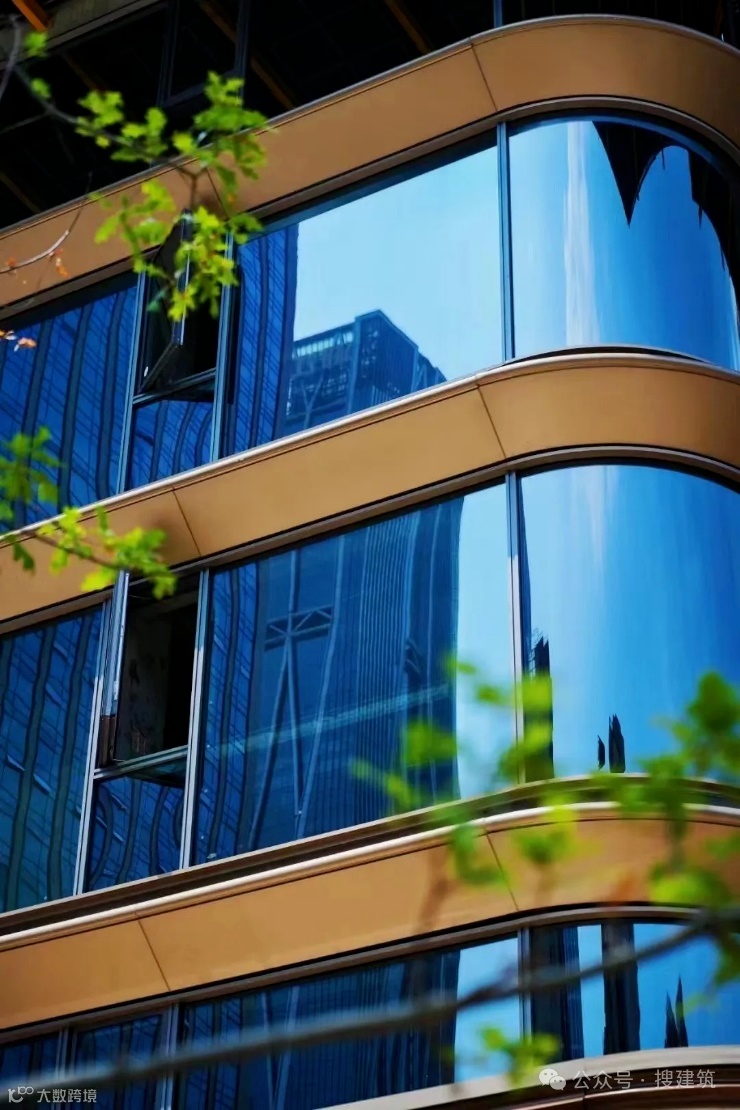 大面积玻璃幕墙搭配银色和香槟色铝板,其超高窗墙比、弧形圆角、转角无柱设计,展现出“无界美学”,仿若凤凰振臂高飞。