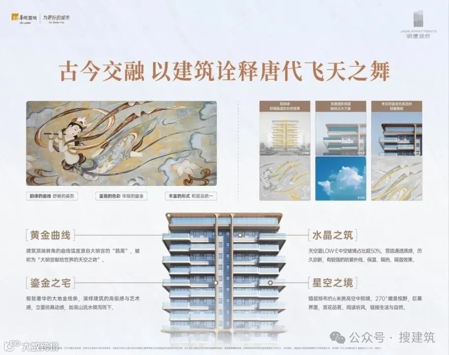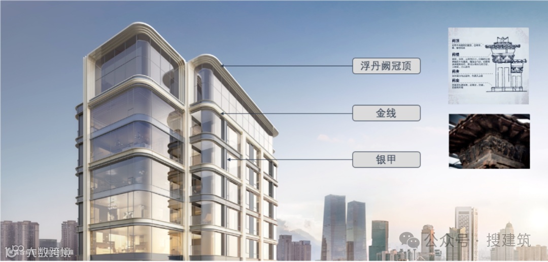 建筑立面以简约的灰白色系为基底,点缀香槟金色,整体设计采用“玉琮+凤鸟冠顶”的形制,局部外立面采用大面积low-e玻璃+石材+金属铝型材+仿石涂料+金属漆等材质,打造简洁舒展的立面肌理。