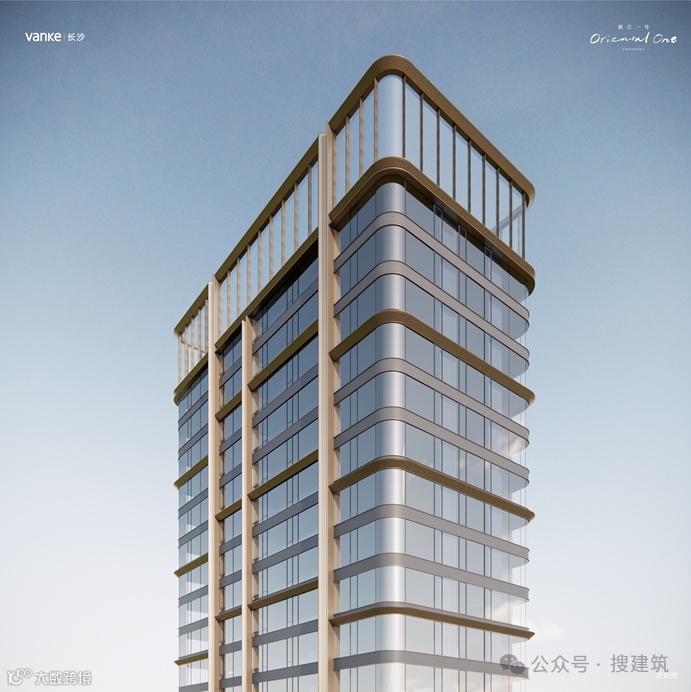 建筑大量运用曲线曲面元素,平衡的体积、起伏的曲线,具有极尽流动动感和精致细节。香槟金铝板搭配270°弧形转角落地玻璃幕墙,超级江景视野。香槟金线条的节奏变化具有螺旋上升的挺拔姿态。