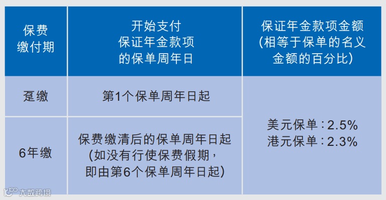 货币:美元或港元(港元保单的保证年金约2.3%,比美元略低)。