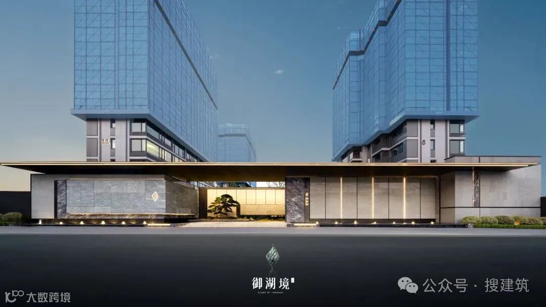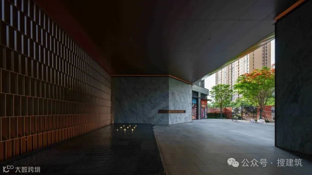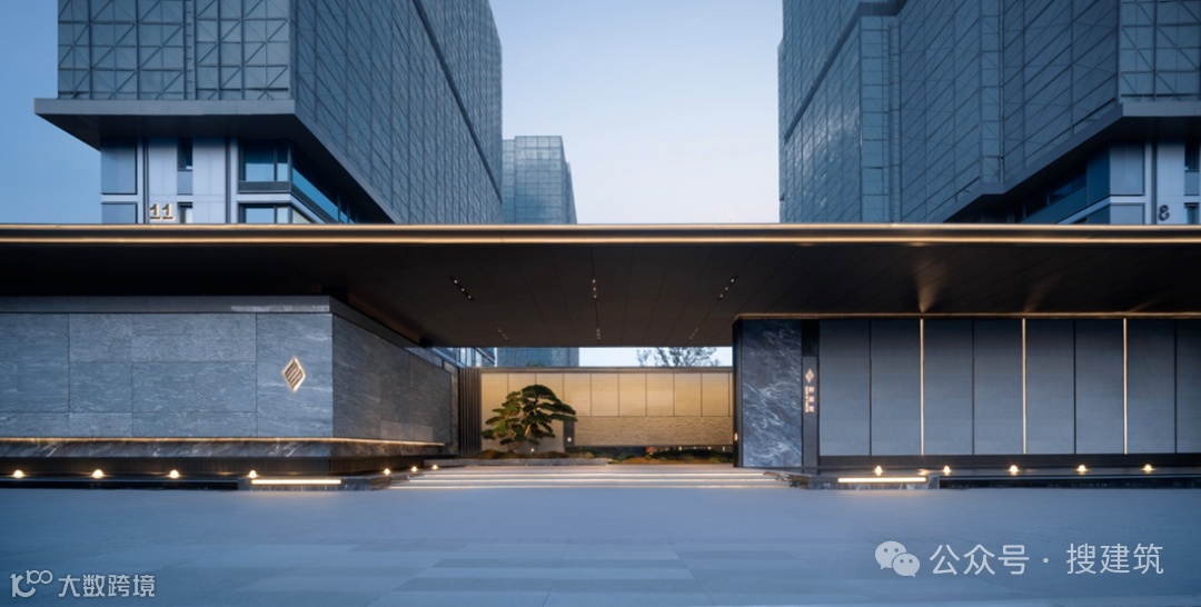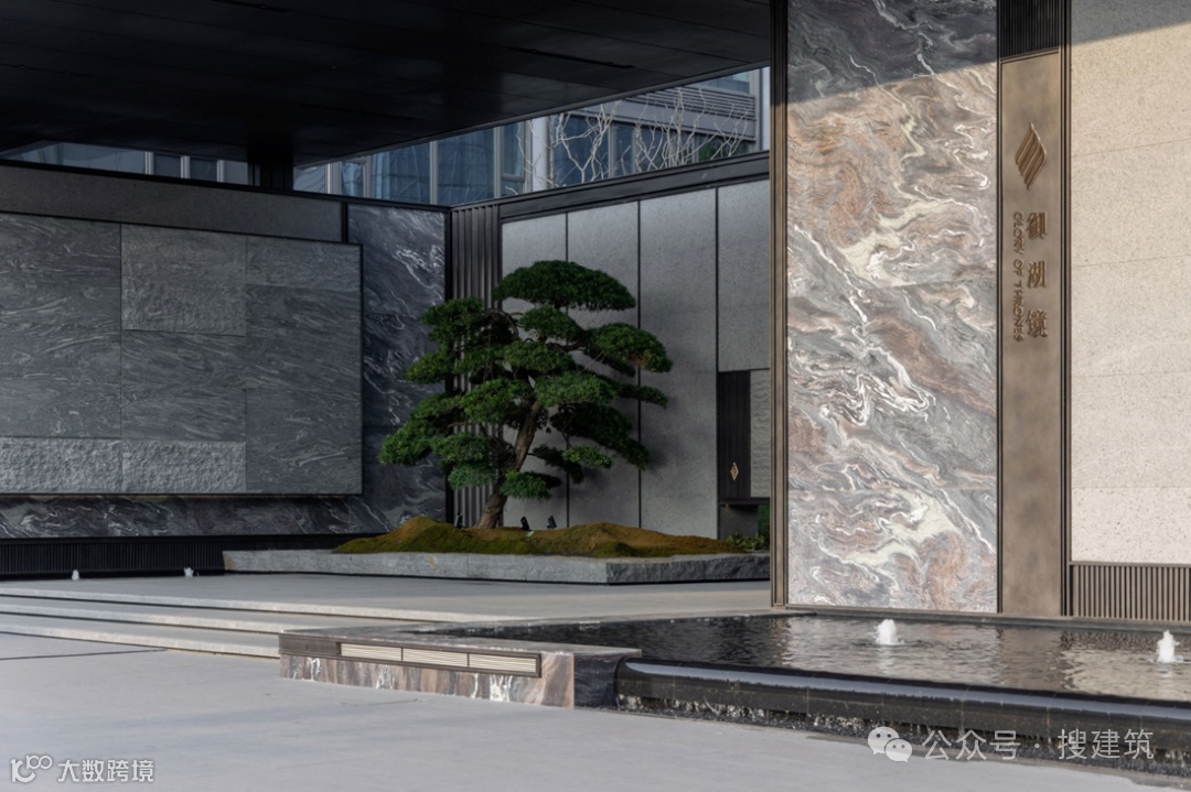 门庭立面由浪淘沙石材搭配金属,宛如墨色在纸上流淌,于黑、白、灰间展现出千变万化的层次和韵味。超尺度入口空间,营造简约大气的归家感受。