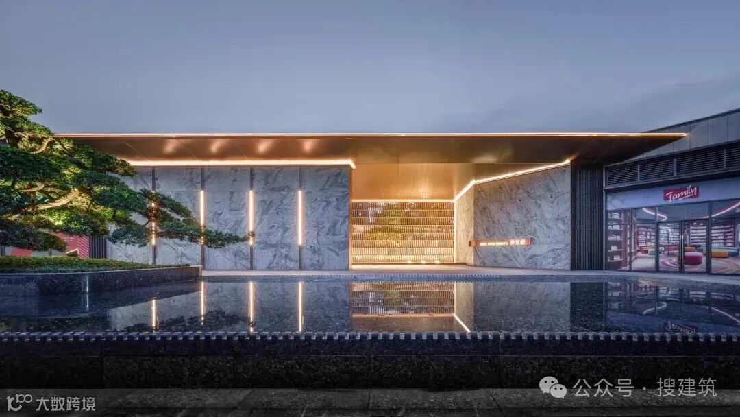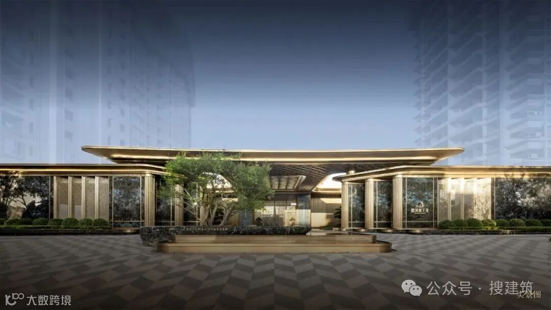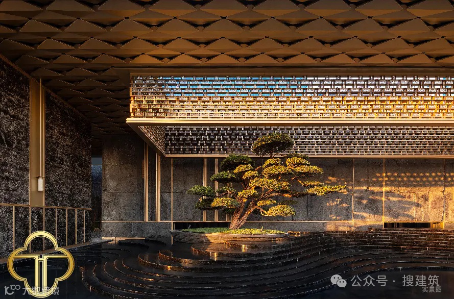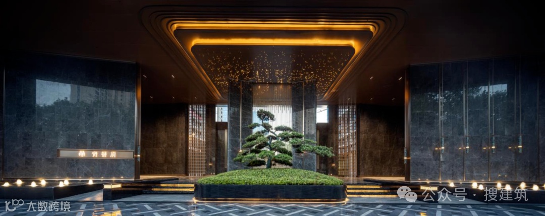 酒店式入口庭院,环岛式落客营造隐奢氛围,昭示仪式感和尊贵感,主入口巨幅金色铝板屋檐,大理石与迎客松构成一幅立体的山水画。
