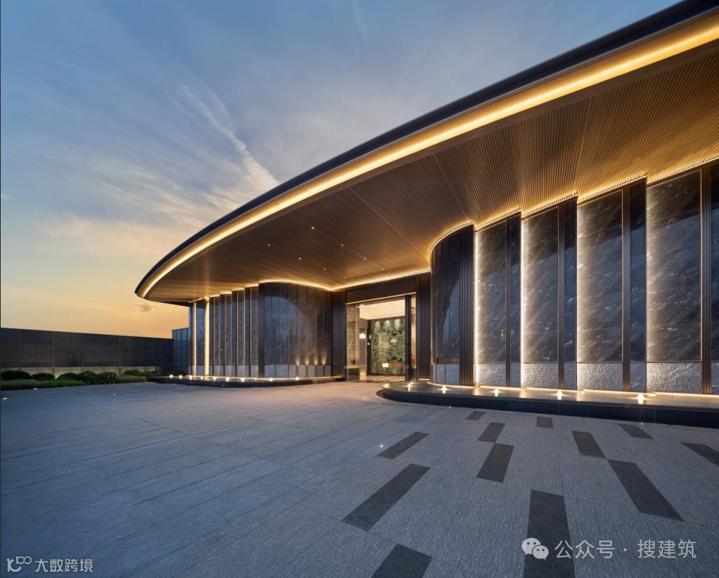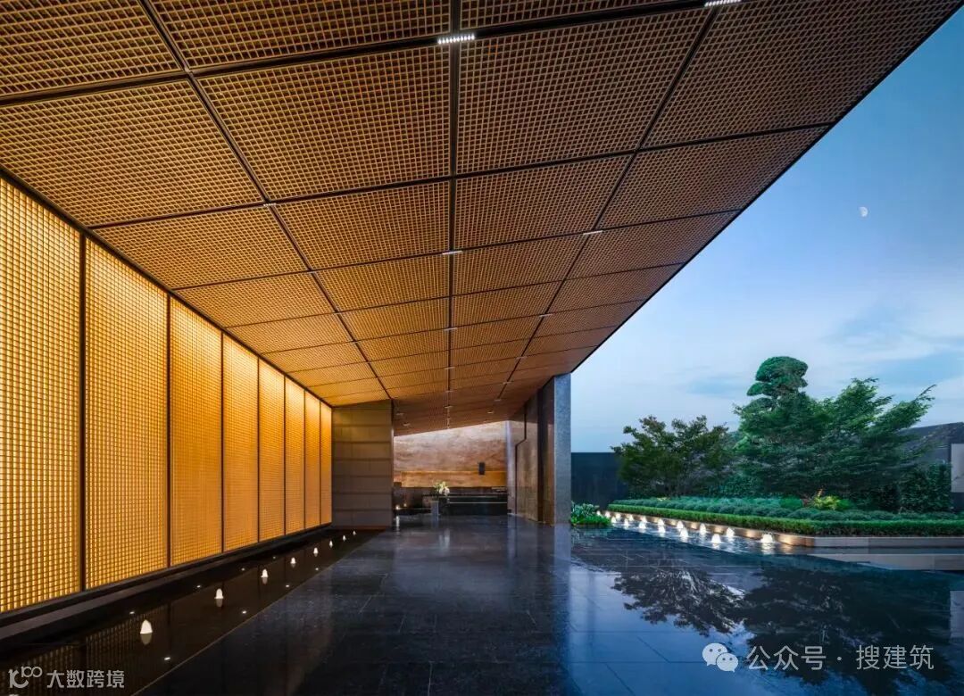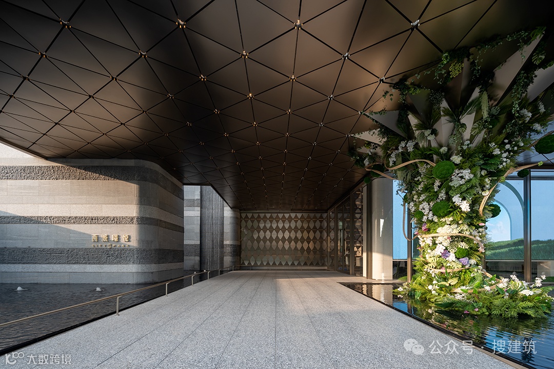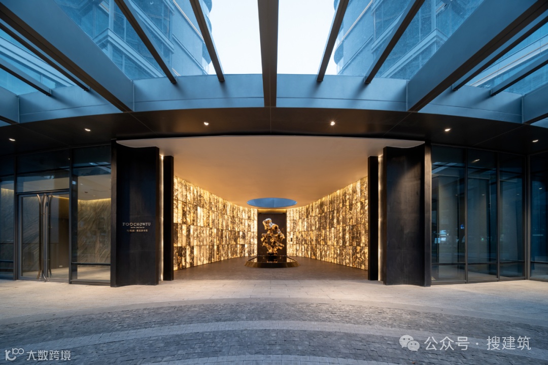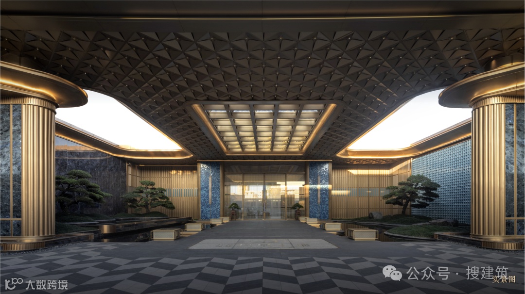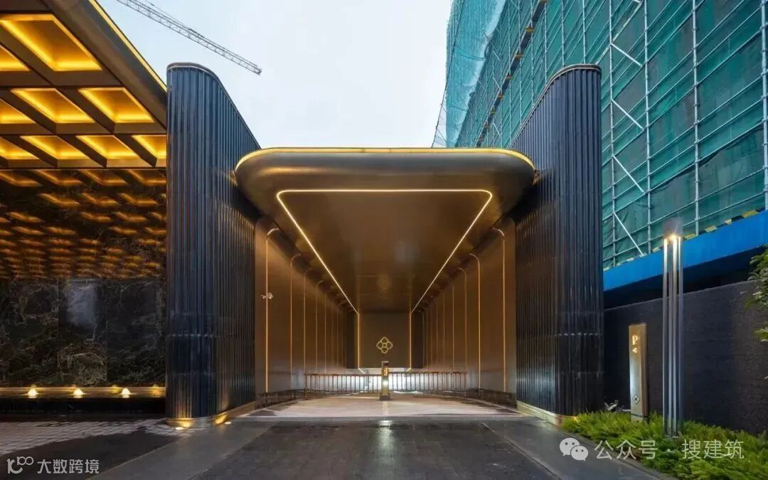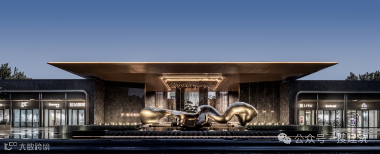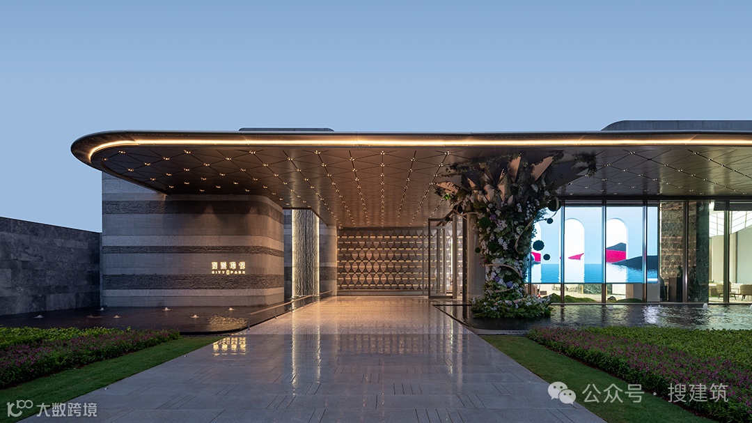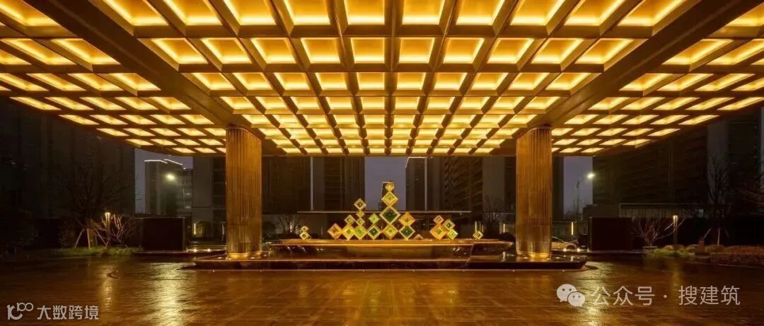 超尺度城市界面与酒店落客前场的组合,营造出高定豪奢的归家仪式感,基于当代艺术,结台前场与门楼一体化打造,诠释高定景现中的定制化体验。