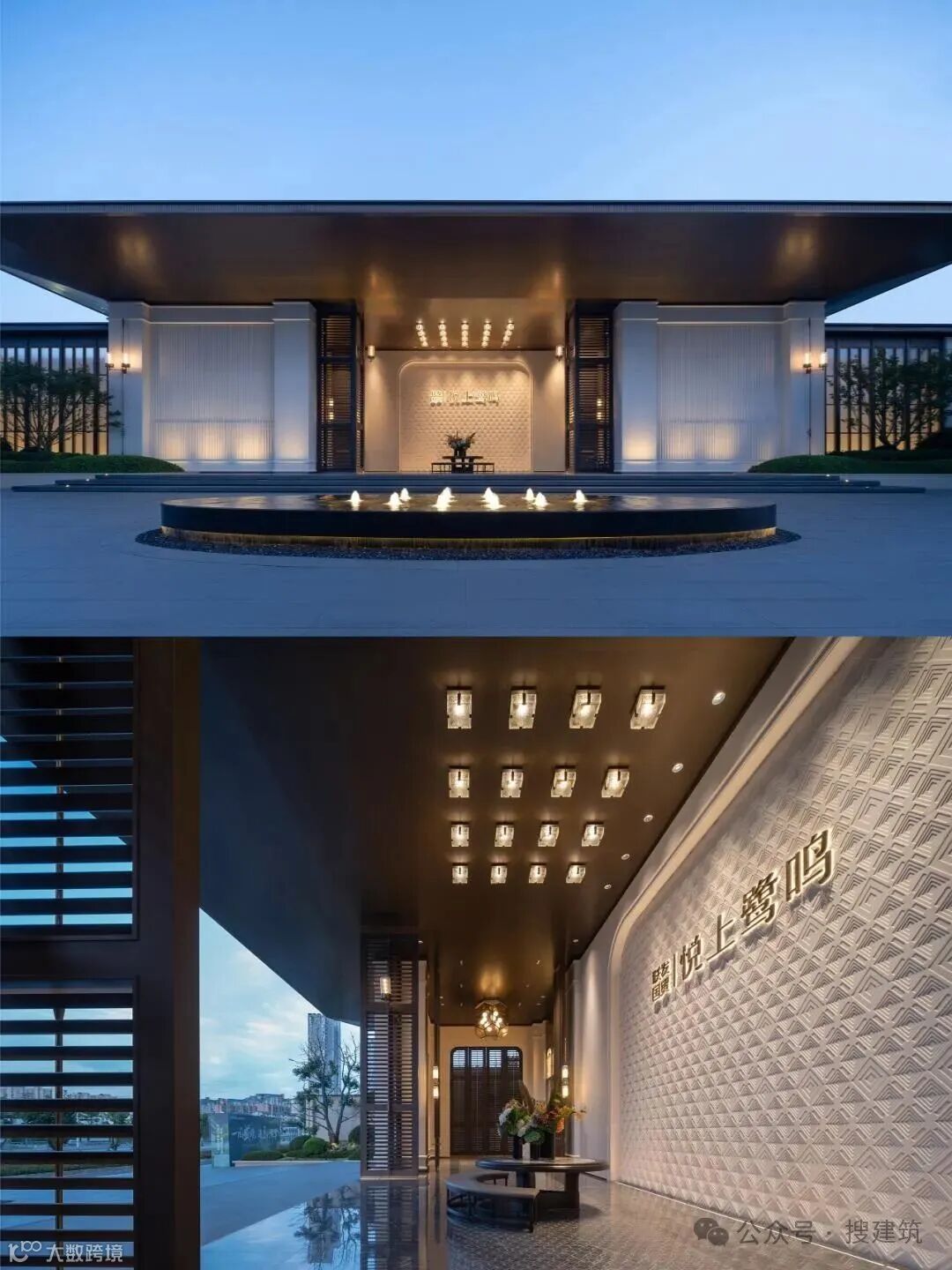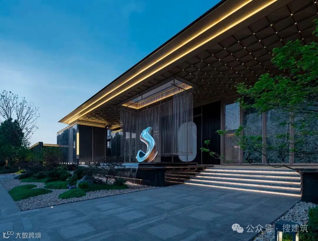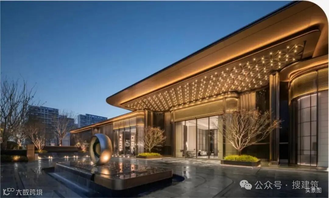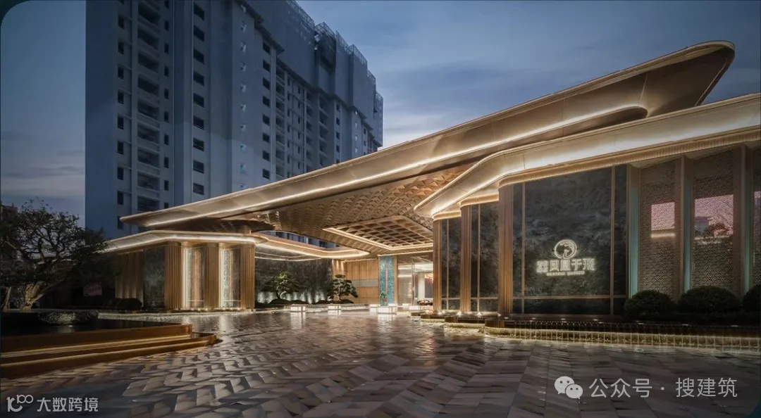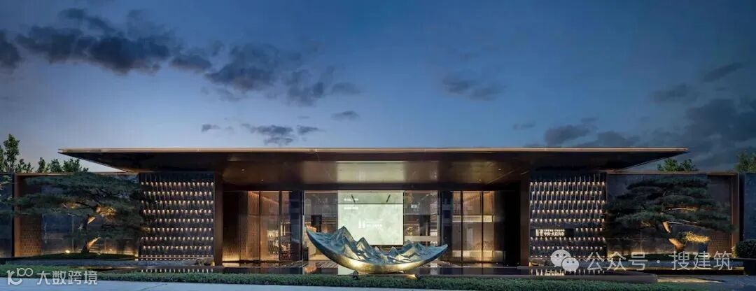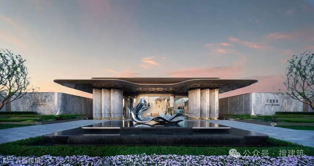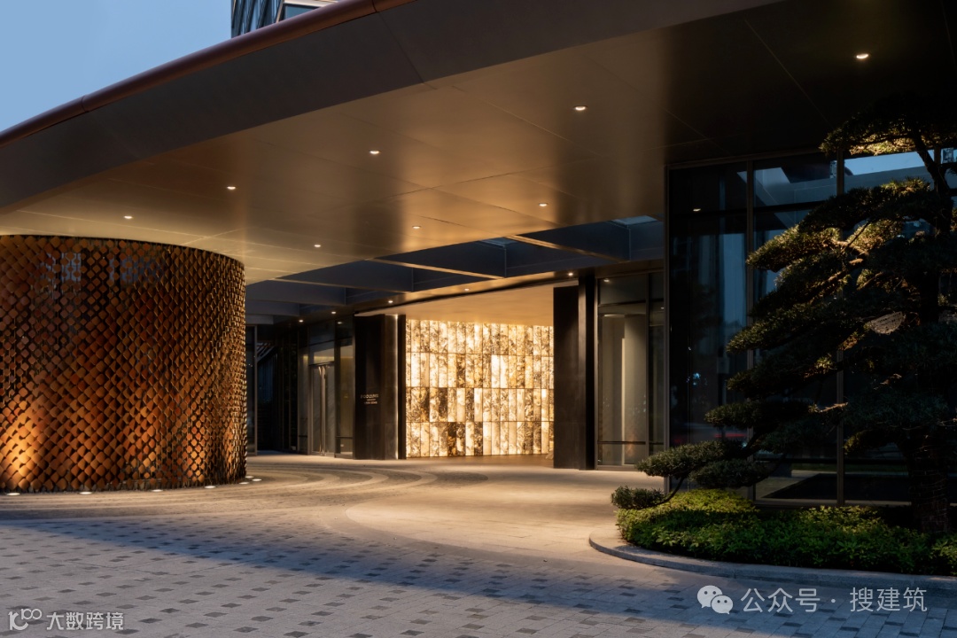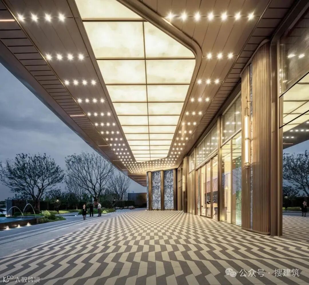 超尺度城市界面与酒店落客前场的组合,营造出高定豪奢的归家仪式感,基于当代艺术,结台前场与门楼一体化打造,诠释高定景现中的定制化体验。