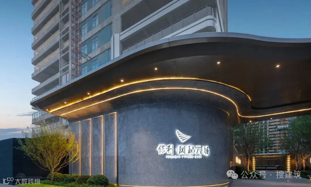 立面弧形定制加工的海蓝宝花岗岩与顶面古铜色铝板的相互映衬,以及凤羽层层线条语言的提炼,力求展现整体全景界面的统一与变化,创造出独一无二的保利未来社区居住入口。